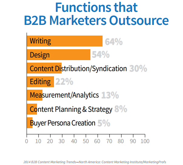 As shown in Figure 1 the content functions that B2B marketers outsource vary from writing to design to distribution to creating a buyer persona. When it comes to outsourcing content functions it doesn’t need to be the kitchen sink.