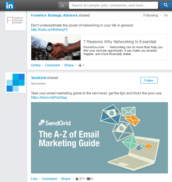 The sponsored post from SendGrid looks just like the other posts in my feed. Another important thing: It’s totally relevant for the kind of content I consume. I might even ignore the comma splice and click on it to get the information about email marketing because that’s what I like to read about on LinkedIn.