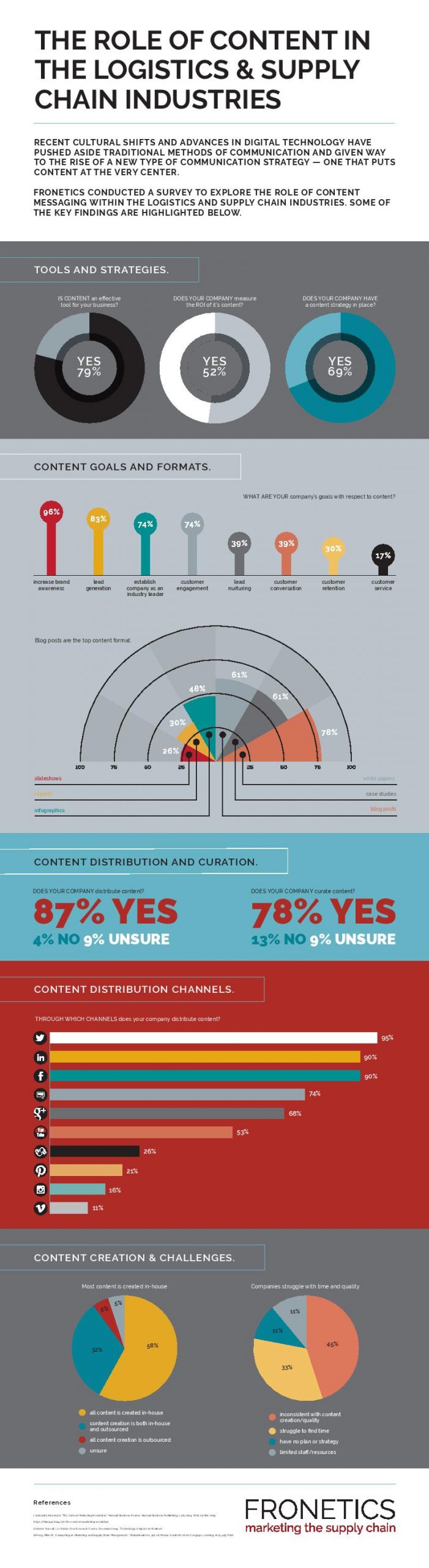 So we at Fronetics polled supply chain and logistics marketers to determine how their companies are using content. We wanted to find out whether it’s working, as well as their challenges; how they approach outsourcing, distribution, and curation; and more. The below infographic illustrates a few of the key findings from our survey.